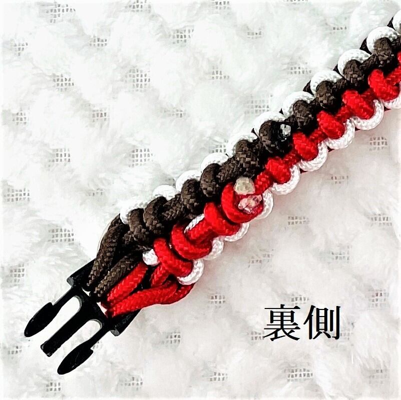 パラコードの径2.4mm丸紐の3本で編み上げています。